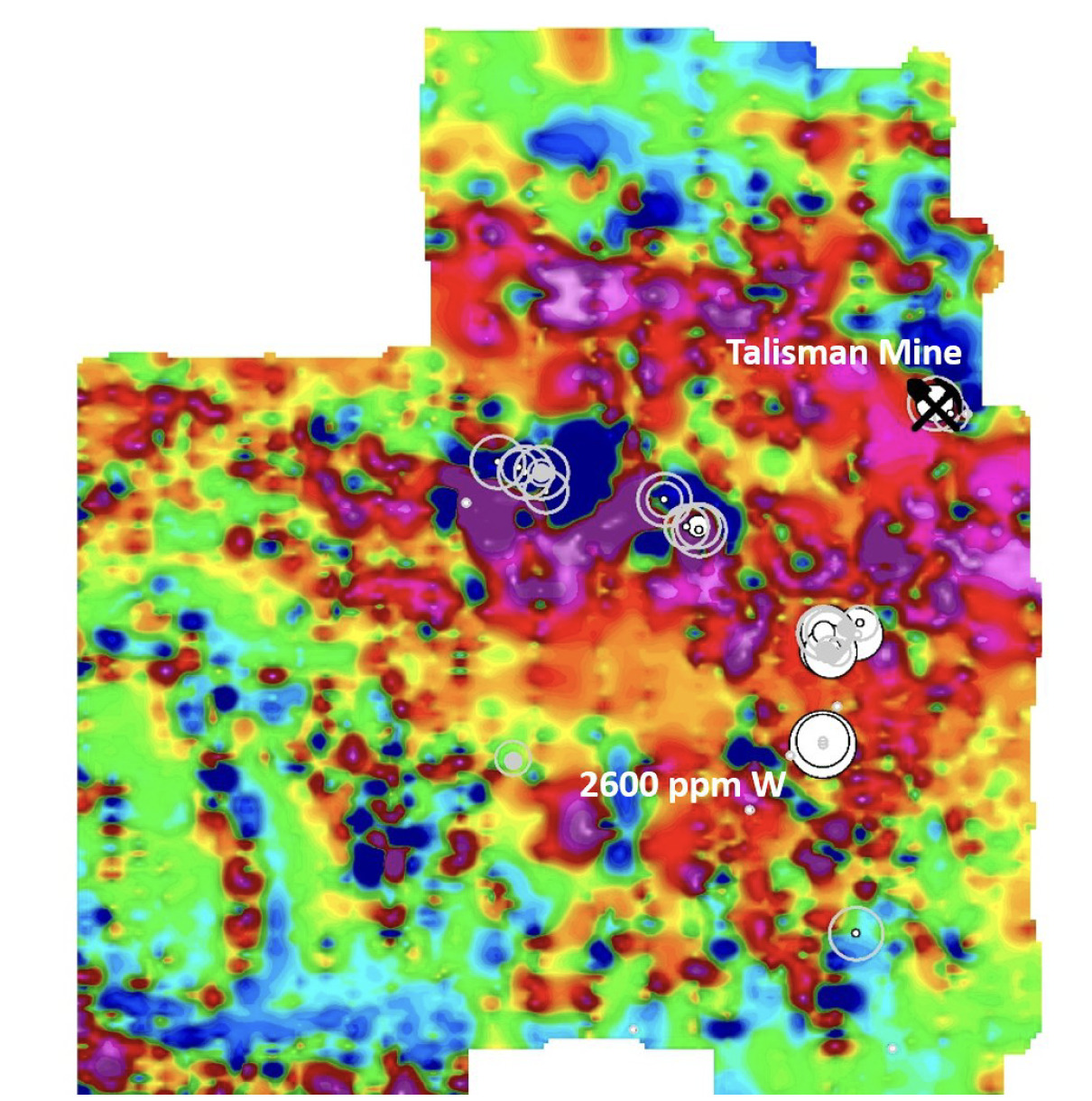 Skarns typically contain magnetite and or pyrrhotite, making magnetic surveying a valuable exploration tool. A ground magnetic survey performed by Adamera shows a strong dipolar magnetic signature over the Talisman Mine. This response is consistent with a typical magnetic response for skarn-style mineralization. This signature extends for hundreds of metres beyond the historic mine workings. A second larger and parallel strongly dipolar anomaly has been identified approximately 600m south of the mine. This anomaly is partially coincident with samples containing high tungsten in outcrop, further supporting the presence of a target zone with significant dimensions.