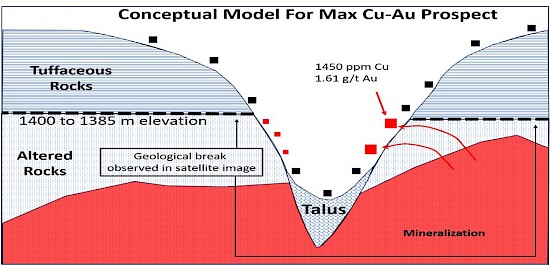 Figure 2. Geological concept model for Max Prospect shows overlying late tuffaceous rocks covering underlying altered rocks. The lower underlying altered rocks contain copper – gold mineralization, while the tuffaceous rocks are not mineralized and mask the mineralized areas. Soil samples collected above the tuffaceous rocks at approximately 1400 to 1385m elevation contain low gold and copper values (black squares). Similarly, below the talus debris in the valley metal values are low. Soil samples collected within the altered rocks, below the tuffaceous rocks and above the talus development contain high gold and copper values proximal to possible copper – gold mineralization identifying a new exploration target for the area.