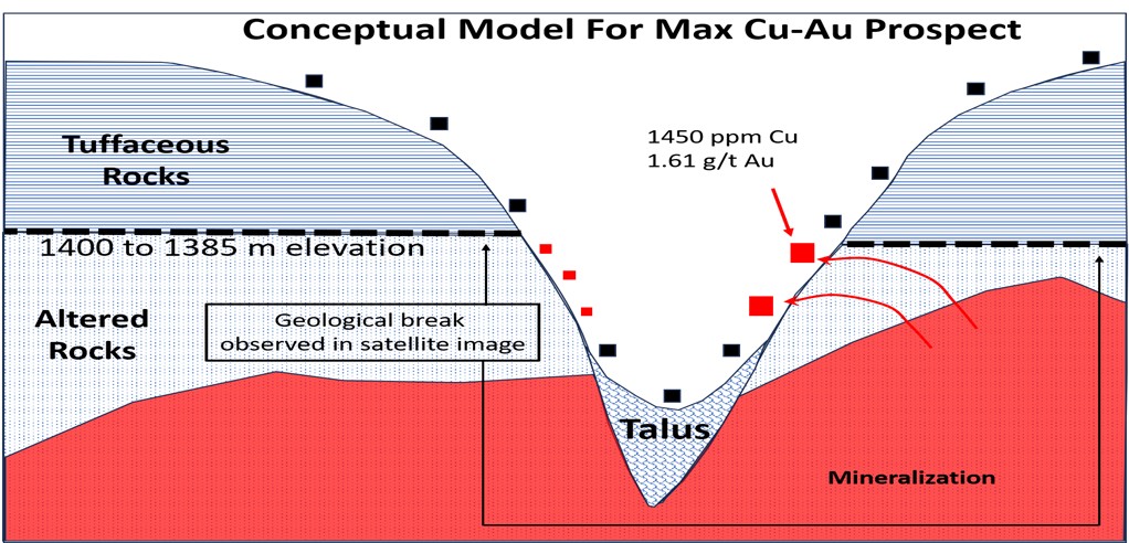 The program focussed on the Max Prospect, which successfully expanded the gold anomaly further east and to the south, and introduced new copper anomalies at a defined elevation of 1,385 to 1,410 metres (“m”). Above this elevation, there is a tuffaceous volcanic unit that appears to mask the underlying anomaly. Below that elevation the slope is also covered by thick talus that also suppresses any geochemical signature (See Figure 2). The geochemically expressive interval appears to correspond with the margins of a structural window that could be revealing a metal-enriched zone of unknown thickness below the volcanic cover rocks.