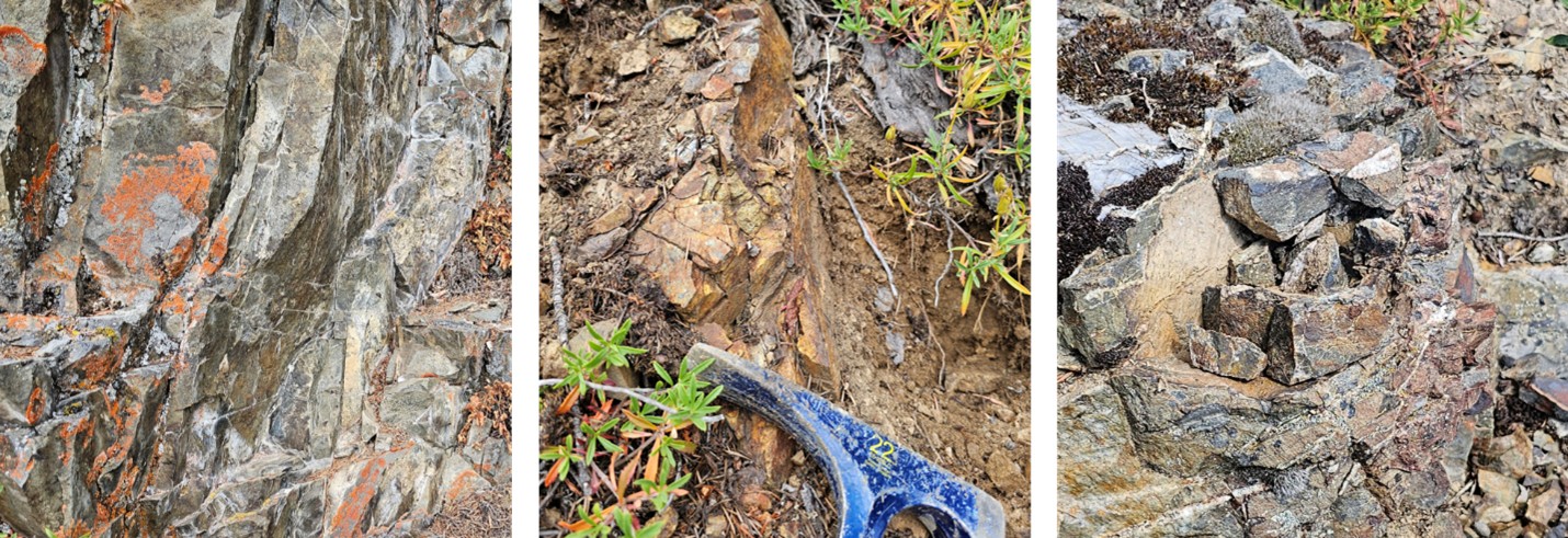 During the 2025 sampling program field observations noted pervasive brecciation, alteration and quartz veining in nearby outcrop. This supports the presence of a mineralizing system at and below this elevation level. See photos below.