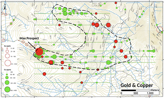 The Max Prospect, which is a recent discovery of high gold and copper values in soil and rock, is now interpreted as the exposed southwest margin of a larger copper – gold system. The high gold and copper values are situated in a steeply incised valley that suggest underlying mineralized rocks associated to an intrusive are exposed at lower topographic levels.