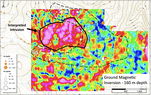 Figure 4 – Presents the ground magnetic inversion at a depth of 160 m and shows a coherent magnetic high feature measuring 1 x 2 km (outlined by solid black line). It is surrounded by the copper (white) and gold (orange) soil anomaly (black dash line) and is interpretated as a possible porphyry intrusion.
