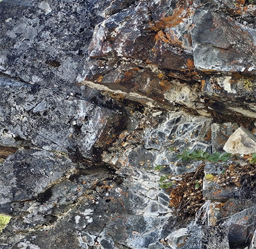Photo 1. Rock Outcrop at Max Prospect showing brecciation, alteration, veining and inclusion of sulphides below the volcanic tuff cover. The photo was taken on a steep slope near high gold and copper values in soil.
