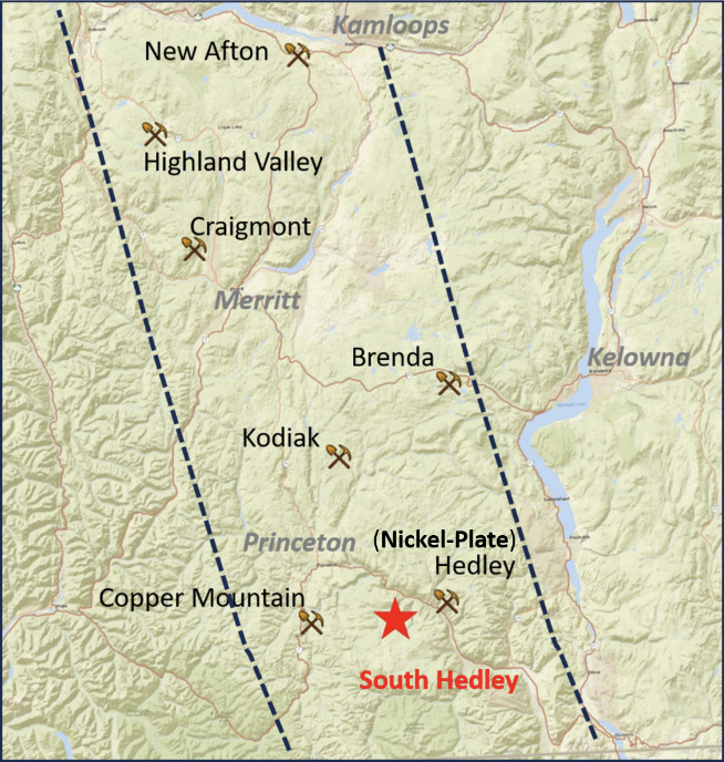 Figure 1 — South Hedley is located between the Nickel Plate Gold Copper Skarn and Copper Mountain Mine and falls within one of Canada’s most productive mineral corridors, the Quesnel Trough regional porphyry belt which contains several other copper-gold deposits including New Afton, Highland Valley, Craigmont and Brenda.