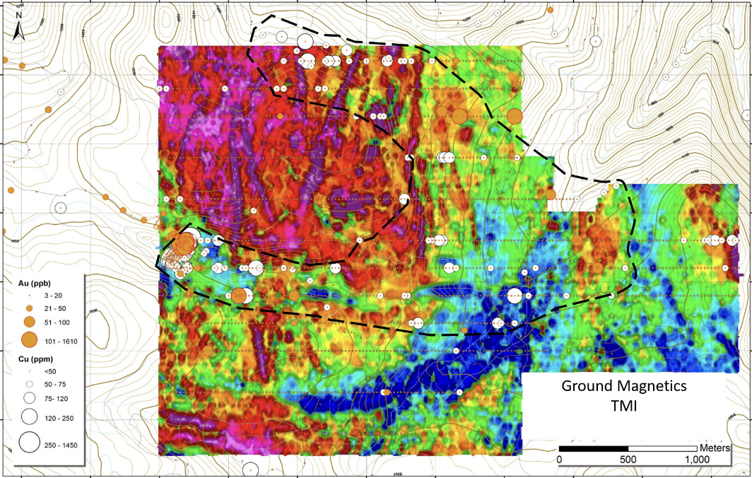 Figure 3 – Ground magnetic data – TMI shows shallow high frequency magnetic high response of near surface rocks in the area in relation to the copper gold in soil anomalies. The black dash line outlines the general extent of the copper (white) and gold (orange) in soil. Figure 4. below shows inversion data whereby the high frequency shallow response is essentially stripped away to expose underlying lower frequency deeper response.