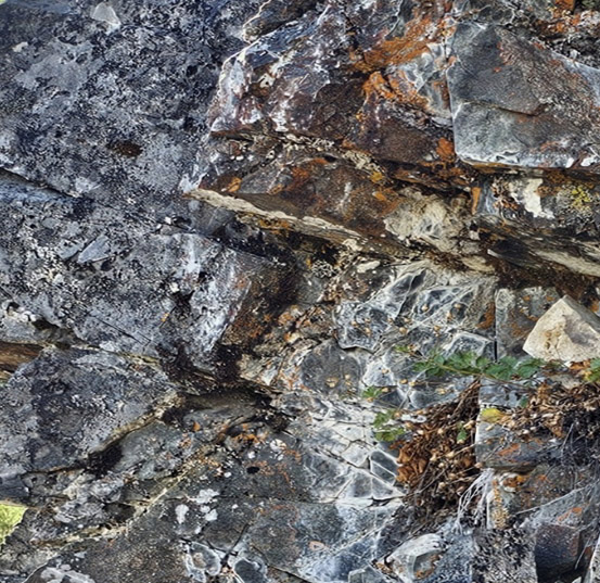 Rocks with alteration and sulphides (see Photo 1 below) located below the barren volcanic tuffs have been identified during soil sampling. The distribution of these rocks will be mapped and sampled once the snow melts in the spring.