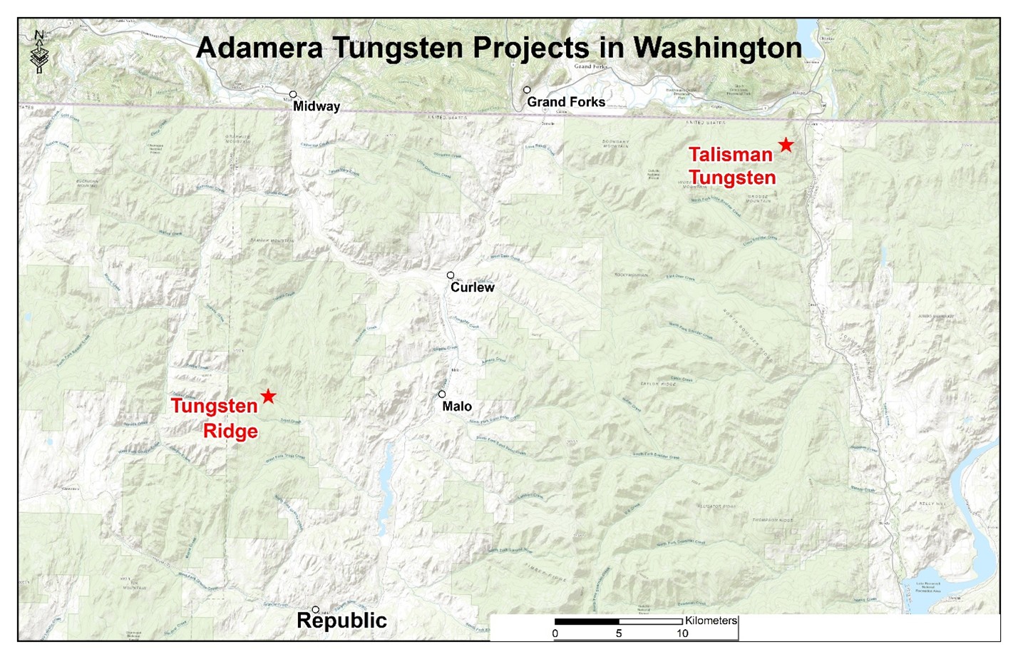 The Company's development of a tungsten property portfolio aligns with the current global supply crisis. Pending standard adjudication, Adamera will fully control two projects in eastern Washington state. Both projects are known to contain tungsten bearing skarn and management believes both have good scale potential. The Company will prioritize exploration spending on its tungsten assets to explore and develop them as expeditiously as possible.